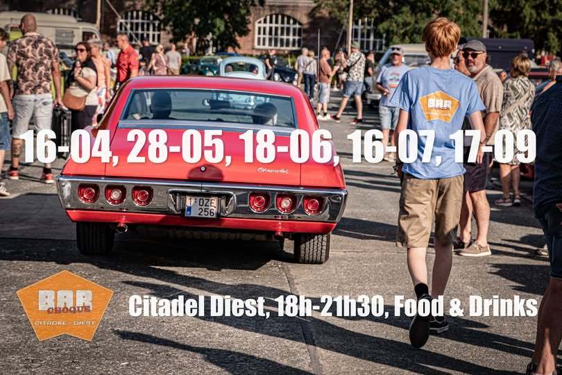 Maandelijkse Oldtimer meeting op het Citadel van Diest volgens het Cars&Coffee concept. Telkens van 18h tot 21h30, food & drinks verkrijgbaar aan de foodtruck en in de gezellige bar. Dit op 16 april, 28 mei, 18 juni, 16 juli en 17 september. In aanloop naar het "Everything on Wheels" evenement op 13 september. Voor meer info en foto's volg ons op Facebook, BAR Choque