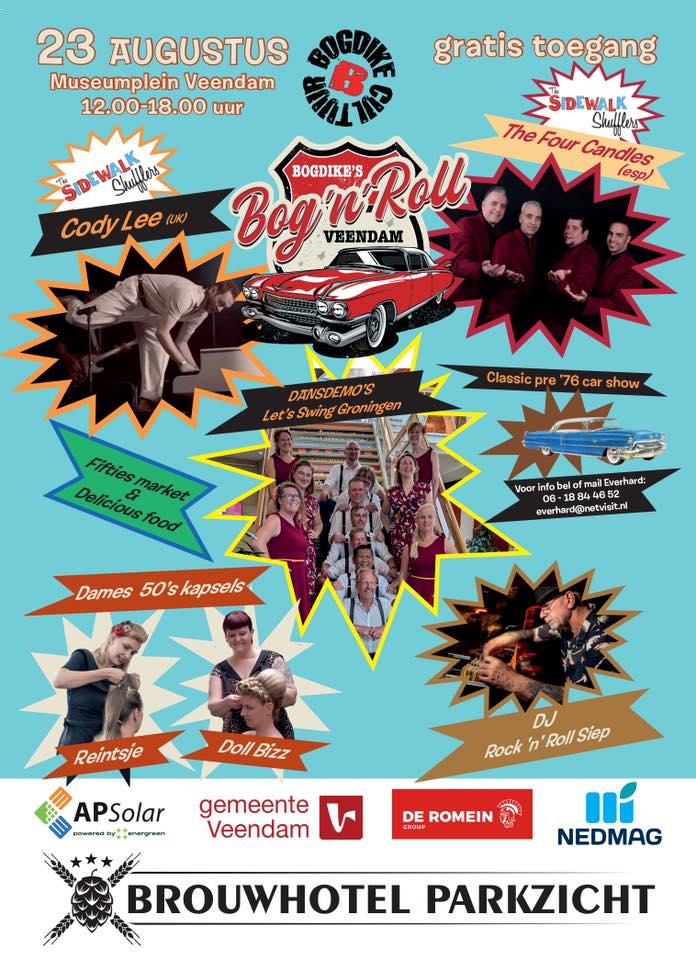 Op zaterdag 23 augustus is het Museumplein in Veendam een kleurrijk en gezellig plein want het staat er bol van de rock 'n roll-liefhebbers, vintage kledingstands en oldtimers.