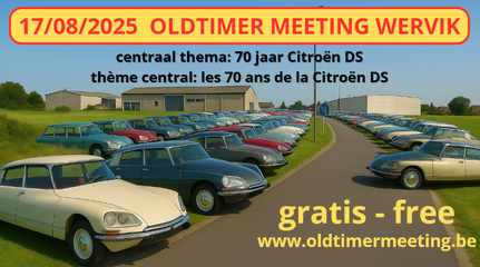 Internationale Oldtimer Meeting in Wervik (b) Het grootste gratis oldtimertreffen van West-Vlaanderen en Noord-Frankrijk, met ruim 1000 antieke voertuigen en 75 stands op post. Alles in een gezellig kader. Gratis inkom, gratis deelname.
