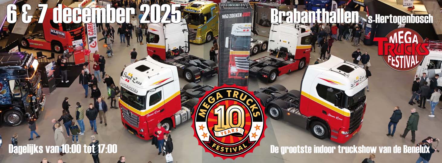 Op zaterdag 6 en zondag 7 december 2025 staan de Brabanthallen weer geheel in het teken van het grootste indoor truckevenement van de Benelux, het Mega Trucks Festival. Na een zeer geslaagd evenement in december vorig jaar, waarbij standhouders, deelnemers en publiek in groten getale naar de Brabanthallen kwamen, belooft de tiende editie een nog groter transportfeest te worden.