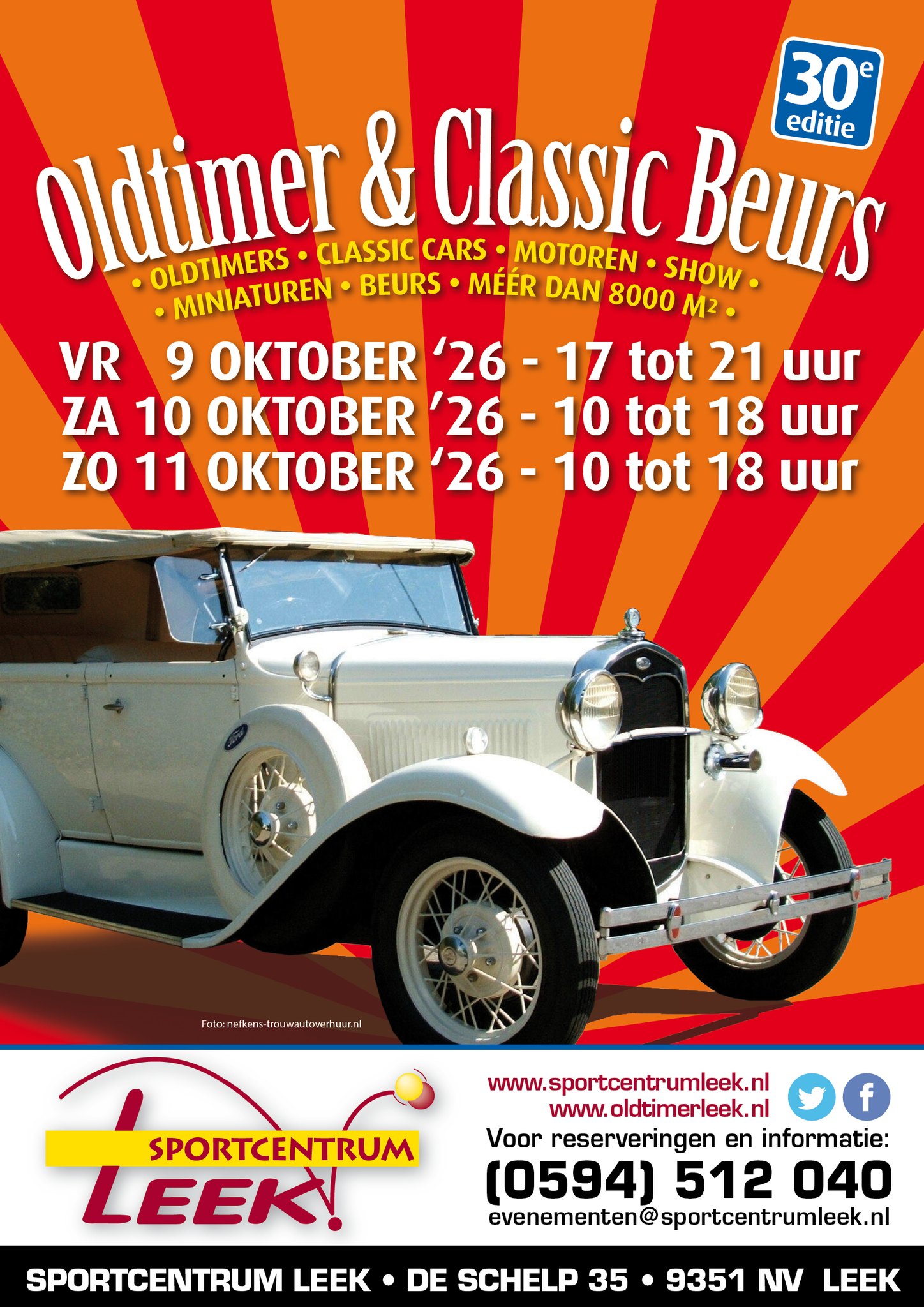 De 30e editie van de Oldtimer & Classic Beurs in Sportcentrum Leek is van vrijdag 9 t/m zondag 11 oktober 2026. Twee grote hallen met meer dan 8000 m2 zijn beschikbaar voor de beurs.