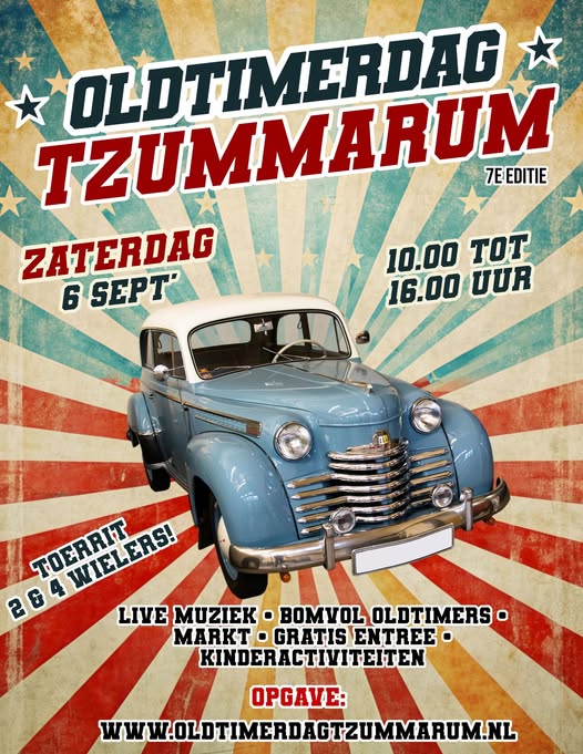 Zaterdag 6 september 2025 verandert de Buorren in Tzummarum vanaf 10.00 uur weer in een groot Oldtimer festival. Rond de 600 old,- en youngtimers worden dan weer uitgestald om te worden bezichtigd door de deelnemers en het publiek. De Buorren in Tzummarum worden weer opgeluisterd door live muziek en voor de jongere oldtimer liefhebbers zijn er diverse activiteiten. De bezoekers met trek in een hapje of een drankje worden deze dag verwend door de plaatselijke horeca in Tzummarum. Rond 11.00 starten de toerritten voor de diverse voertuigen en worden de voertuigen beoordeeld voor de "Show and Shine" contest . De deelnemers aan dit evenement ontvangen zoals voorgaande jaren weer het "Oldtimerdag Tzummarum"vaantje. Deelnemen en bezoeken is natuurlijk geheel gratis.