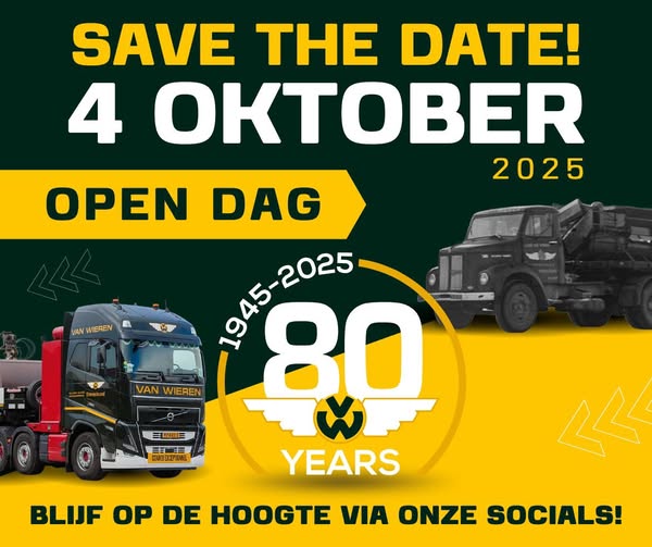 Op 1 oktober 1945 schreef opa Lukas zich in bij de kamer van koophandel samen met zijn broer Jan als gebroeders Van Wieren. Het bedrijf was toen 1 van de eerste ondernemingen van Emmeloord. Op 1 oktober 2025 bestaan wij 80 jaar, alle reden voor een feestje dus. In het weekend van 3 en 4 oktober zullen er verschillende festiviteiten zijn. Zo is er op zaterdag 4 oktober een open dag, noteer deze datum alvast.
