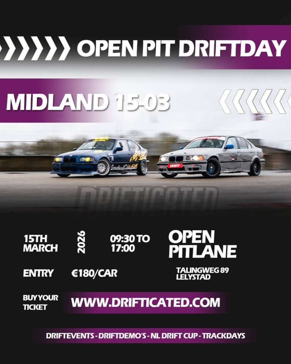 15 maart hebben we alweer onze 2e driftdag van 2026 op het Midland Circuit. Het gaat om een open pitlane driftdag van Drifticated. Georganiseerd op het Midland Circuit in Lelystad. Van 09:30 tot 17:00 kan er continu gedrift worden op een natte baan.