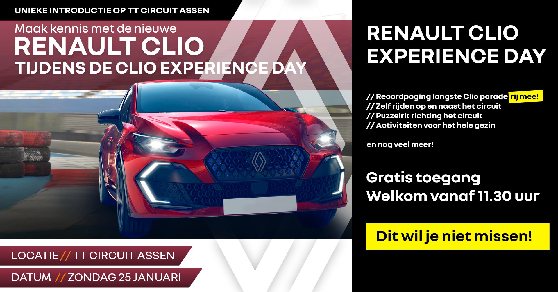 Op zondag 25 januari 2026 organiseren wij samen met de Renault dealers van Noordoost Nederland en GP Elite de introductie van de nieuwe Renault Clio op het TT Circuit in Assen. Een dag voor jong en oud, vol beleving en actie. Geen standaard introductie, maar een unieke ervaring op een bijzondere locatie. Daar wilt u bij zijn!