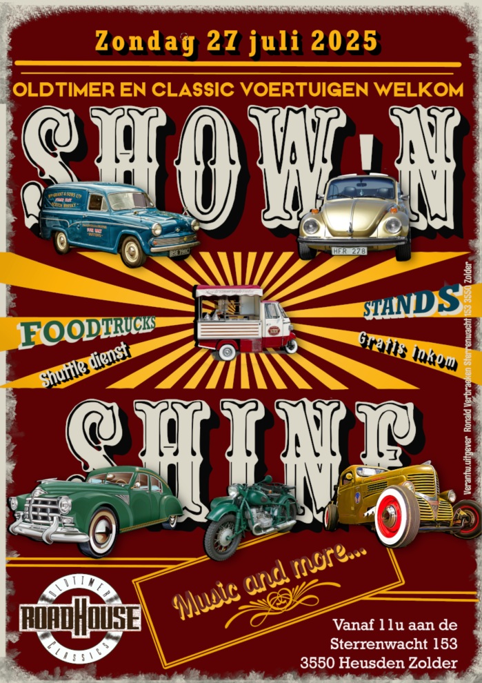 Onze jaarlijkse Show 'n Shine is inmiddels her en der gekend. Jaarlijks komen oldtimerliefhebbers van overal samen naar deze plaats om hun schat op vier wielen te showen, sommigen op twee wielen. Niet enkel komt er een massa volk op de been om deze prachtstukken uit een nostalgisch verleden te bewonderen maar ook om te vertoeven in de gezelligheid van oude bekenden en nieuwe ontmoetingen terwijl er de nodige sfeer wordt opgebouwd door een live optreden. Op het ronde plein aan de Roadhouse staan een aantal stands met veel leuke hebbedingen en uiteraard wil men ook het lichaam behagen. Hiervoor kunt u aanschuiven bij de Foodtrucks , of genieten van de verfrissingen van op het terras (of binnen) van ons clubhuis de ROADHOUSE CLASSICS.