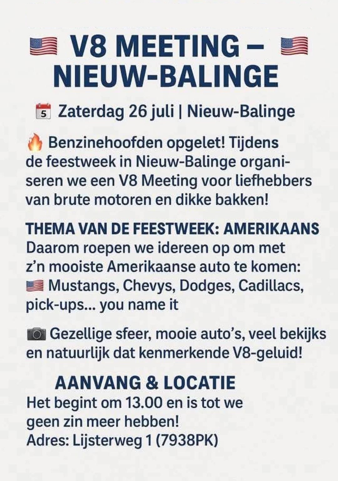 Benzinehoofden opgelet! Tijdens de feestweek in Nieuw-Balinge organiseren we een V8 meeting voor liefhebbers van brute motoren en dikke bakken!