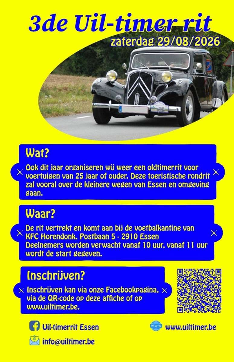 Dit zal weer een toeristische rondrit voor oldtimers zijn met roadbook (Bolleke-pijl) over de meer landelijke wegen in Essen en omgeving. Iedereen met een auto ouder dan 25 jaar kan hier aan deelnemen.