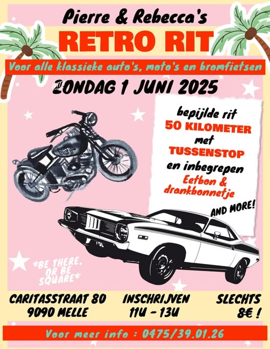 Alle klassieke auto's-bromfietsen-motoren zijn van harte welkom voor een leuke tocht van ongeveer 50 km met vertrek op Family Fun Day Caritasstraat 80 te 9090 Melle