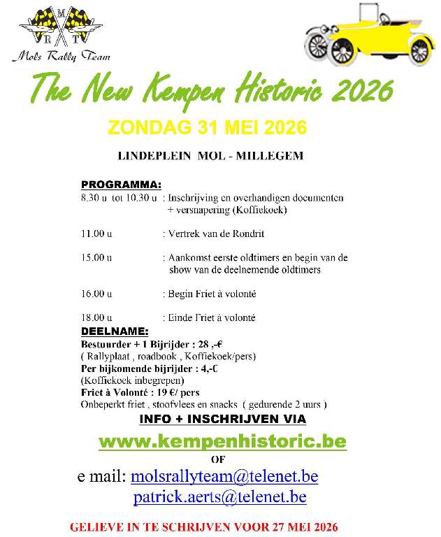 Na onze mooie editie van vorig jaar gaan we dit jaar opnieuw The New Kempen Historic 2026 organiseren. De Mollenrit zal ons hierbij wat ondersteunen, zij zetten zich al jaren in voor het goede doel "Help Brandwonden Kids". Door deze samenwerking kunnen wij dan ook ons steentje bijdragen aan het goede doel.