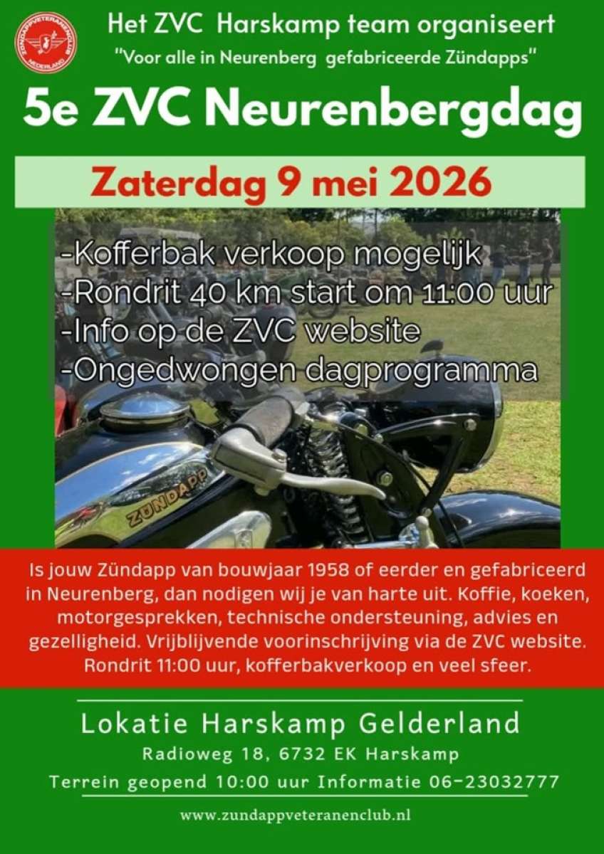 De Zündapp Veteranen Club organiseert op zaterdag 9 mei 2026 voor de vijfde keer een speciale dag voor Zündapp motoren die vóór 1958 in Neurenberg zijn geproduceerd; de Neurenberg dag!