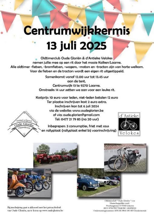 Oldtimerclub Oude Gloriën & d'Antieke Velokes nemen jullie mee op een rit door het mooie Kalken/Laarne. Alle Oldtimer -fietsen, -bromfietsen, -wagens, -motors en -tractors zijn van harte welkom. Voor de fietsers en tractors wordt een eigen rit uitgestippeld.