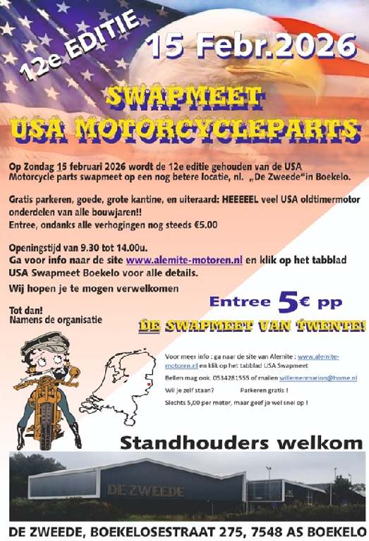Op zondag 15 februari 2026 wordt de 12de editie gehouden van de USA Motorcycleparts Swapmeet op een nog betere locatie, nl. "De Zweede" in Boekelo.